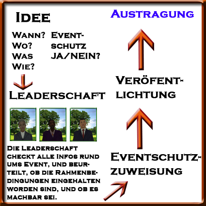 Anfangen möchte ich hier mit der Erklärung, wie ein Event von der Idee an organisiert wird und welche Schritte das fertige Event gehen muss, bis es ausgetragen werden kann.