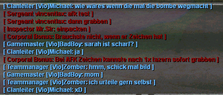 [Vio]Zomber: Je mehr Personen in gleichen Unterhaltungen sind, desto wahrscheinlicher ist es, dass es mehrere verschiedene "Gruppen" gibt. "Gruppen" in dem Sinne, dass die Angehörigen der jeweiligen Gruppe einer gemeinsamen Tätigkeit nachgehen. Die Einen machen einen Shoprob, die Anderen spielen Bomberman, zwei weitere wickeln grad einen Deal ab und vielleicht macht noch jemand eine Gangmission. Dazu foltert Techno noch alle durch seine Gesangskünste und/oder klugen Kommentare zu den Dingen, die nur er selbst gerade liest oder anschaut. Das alles gleichzeitig zu hören oder zu lesen empfinde ich als unangenehm, und deswegen bin ich am liebsten immer mit nur einer "Gruppe" in der selben Unterhaltung.